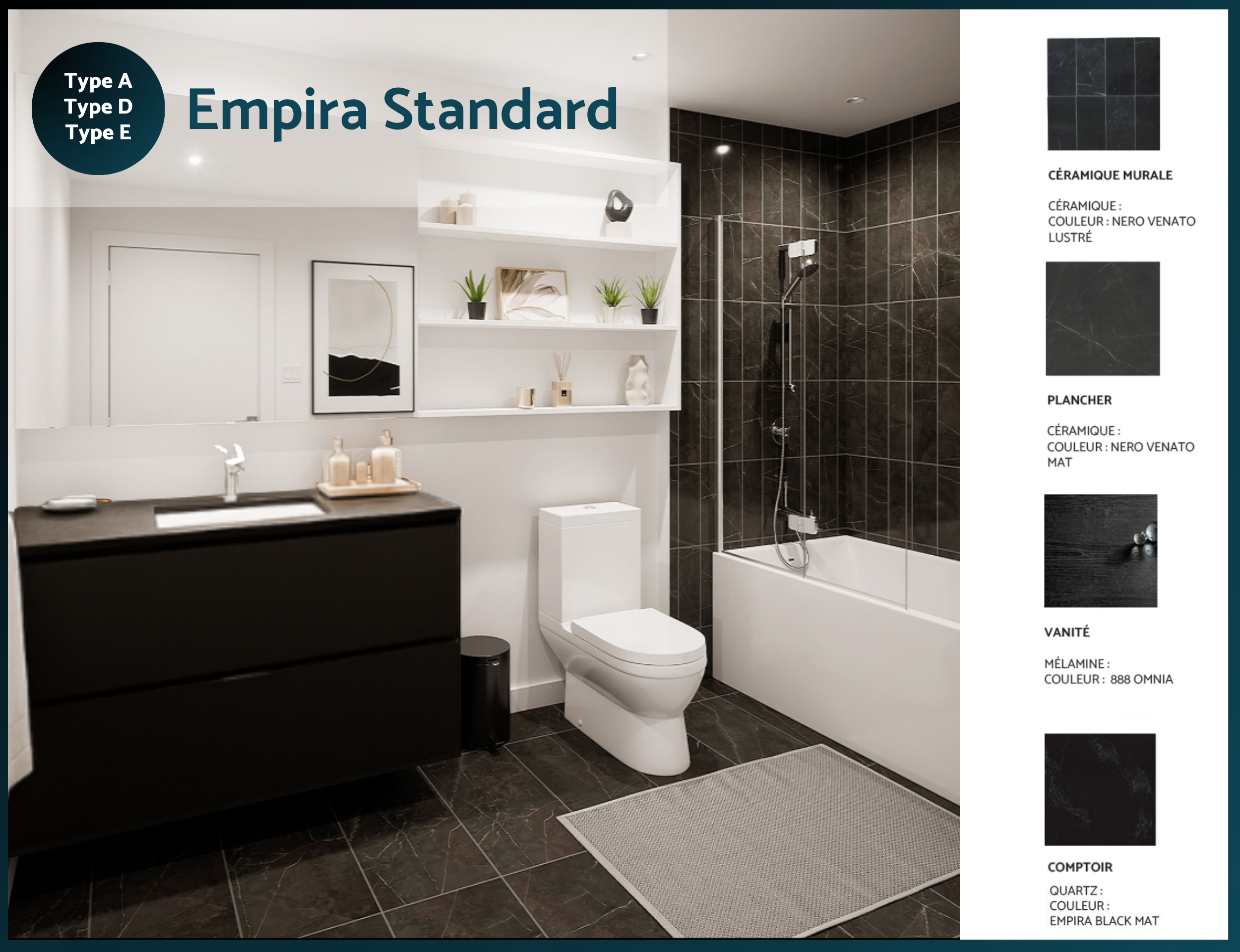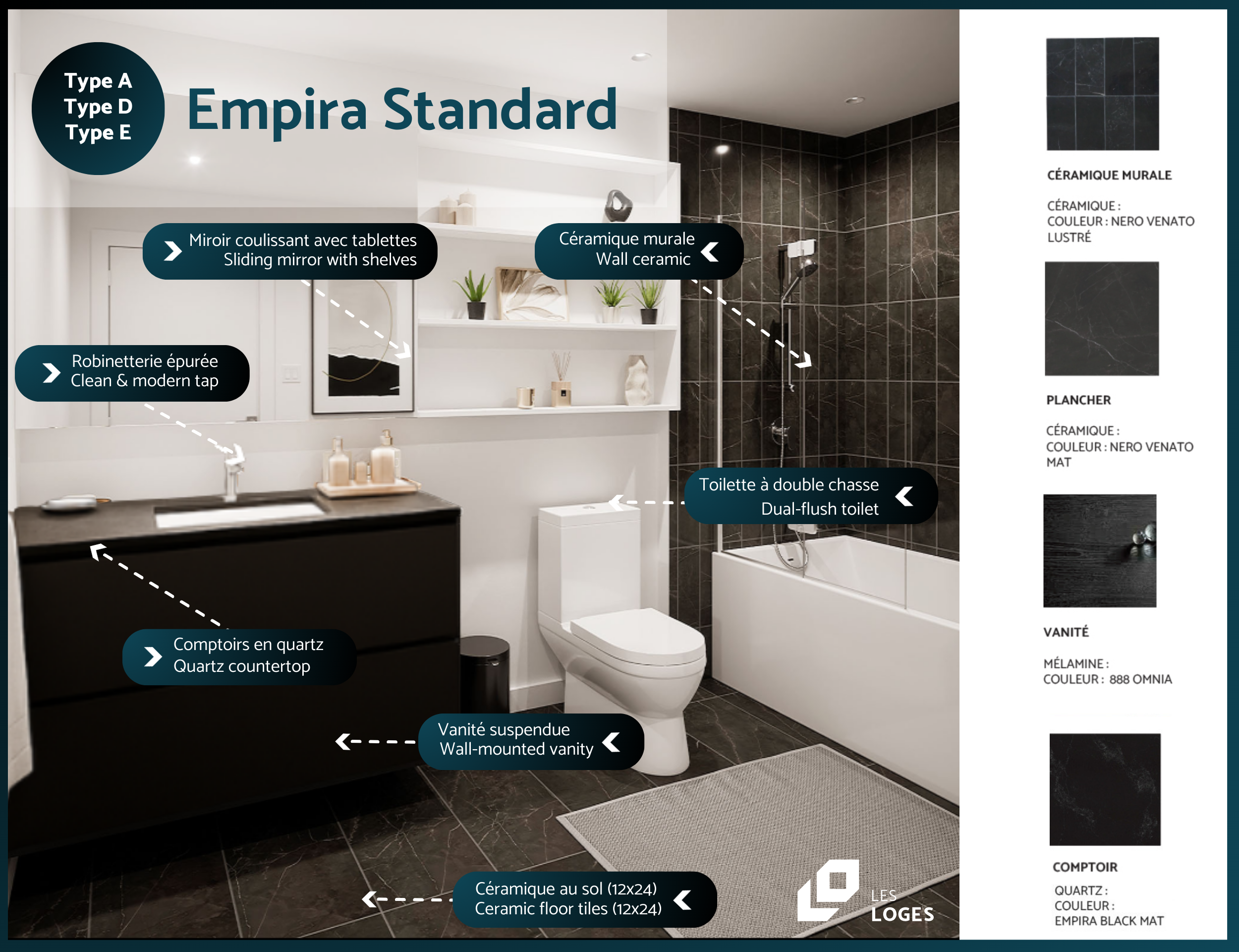• Miroir coulissant avec tablettes intégrées • Vanité suspendue avec comptoir de quartz • Céramique au sol 12’’X24’’ • Robinetteries aux lignes modernes • Toilette de style contemporain